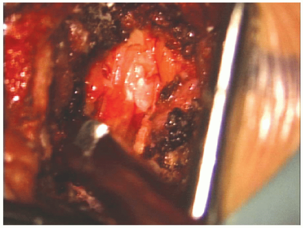FIGURE 17-24. The dural tube is exposed under the overlying epidural fat (arrow).