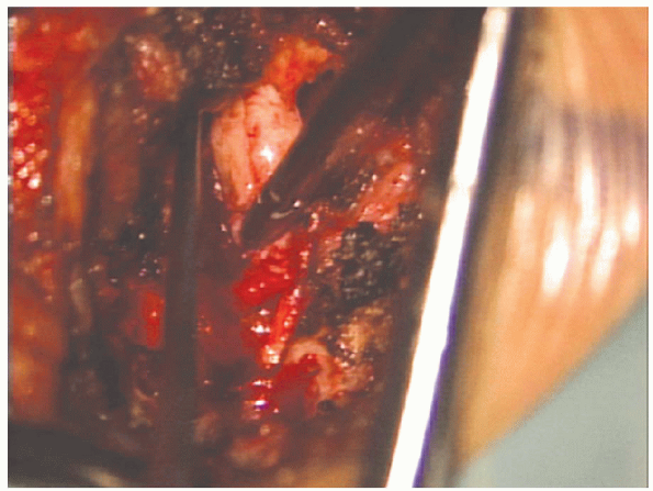 FIGURE 17-26. Large extruded fragment being removed from under the nerve root.