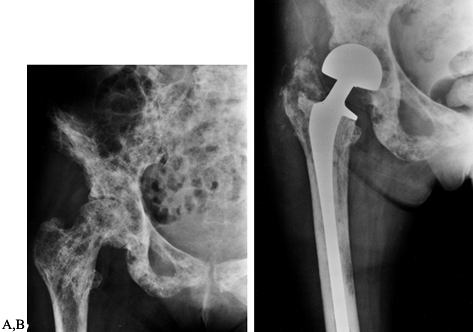 Figure 130.4. A: Anteroposterior radiograph of the tibia showing a destructive lesion in a patient with renal cell carcinoma. B: Anteroposterior radiograph of the tibia following curettage and methyl methacrylate augmentation and plate fixation. C:
