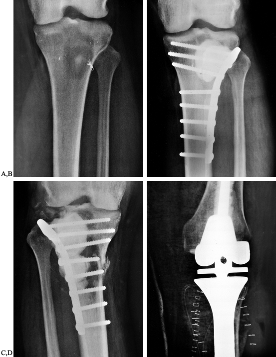 Anteroposterior radiograph of the tibia showing progressive bone destruction following two courses of external beam irradiation and plate fixation with cement augmentation. D: Anteroposterior radiograph demonstrating resection of the proximal tibia and reconstruction with a custom modular knee replacement. |