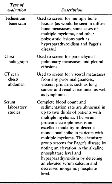 technetium bone scan, chest radiograph, computerized tomographic (CT)