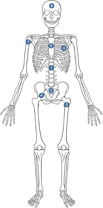 Thoracolumbar spine > sacrum > proximal femur > pelvis > ribs > sternum > proximal humerus > skull