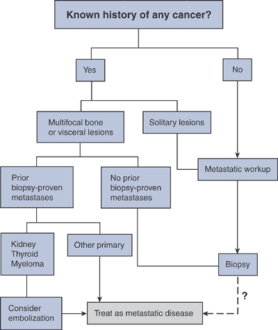 | Algorithm 8-2 Evaluation for metastatic disease of unknown primary site. (Adapted from Rougraff BT, Kneisl JS, Simon MA. Skeletal metastases of unknown origin: A prospective study of a diagnostic strategy. J Bone Joint Surg [Am] 1993;75:1276–1281.) |