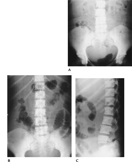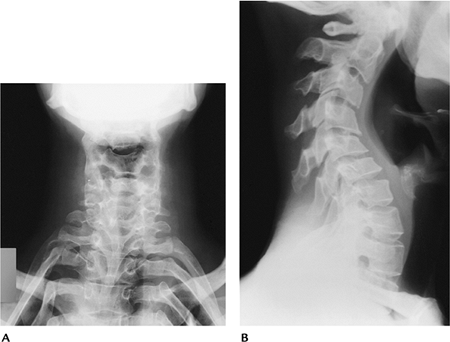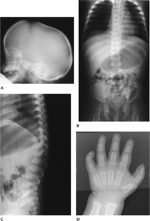 FIGURE 15-41 Thalassemia major. (A) Lateral radiograph of the skull demonstrating the “hair-on-end” appearance. AP (B) and lateral (C)