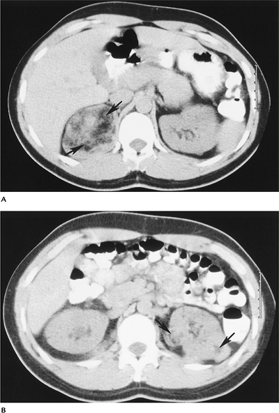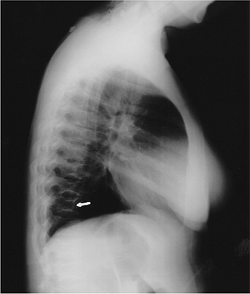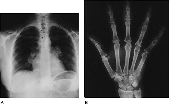 FIGURE 15-42 Sarcoidosis. (A) PA radiograph of the chest showing bilateral hilar and right paratracheal adenopathy. Note the tracheal deviation (arrows). (B)