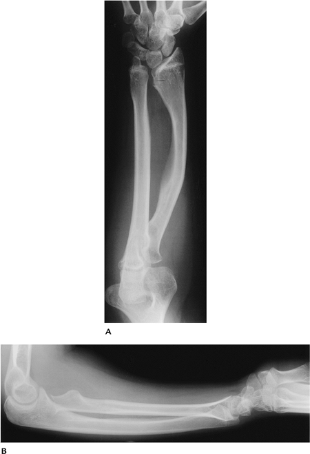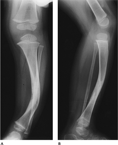 FIGURE 15-4 Melorheostosis. Lateral (A) and AP (B)