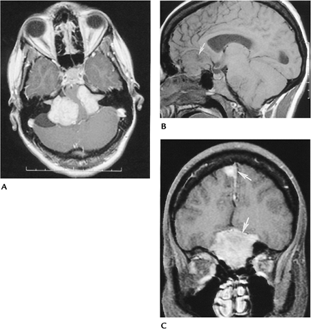 FIGURE 15-43 Sagittal T1- (A) and T2-weighted (B) images of the spine demonstrate multiple lesion (arrows) that would be difficult to differentiate from metastasis.