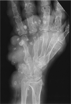 Radiograph of the right hand showing lacelike trabecular pattern and cystic changes in the third middle phalanx and fourth proximal phalanx. |