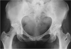 Osteopoikilosis. AP radiograph of the pelvis and hips showing multiple small sclerotic foci in the proximal femora, ischia, and acetabuli. Note the femoral striations (arrows) (osteopathia striata is related to osteopoikilosis). |