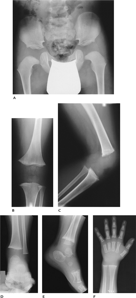 radiographs of the knee show marrow expansion, thin cortex with sparse trabeculae, and the Erlenmeyer flask deformity in the femur (B). Radiograph of the hand (D) demonstrating marrow hyperplasia with cystic lesions. Axial CT image (E) shows expansion of the ribs and soft tissue masses caused by extramedullary hematopoiesis. |