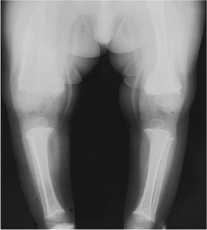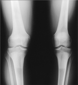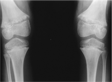 Melorheostosis. Standing views of the knees showing sclerosis and cortical thickening that crosses the joint into the soft tissues. The tibia also is involved. |