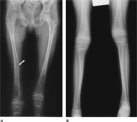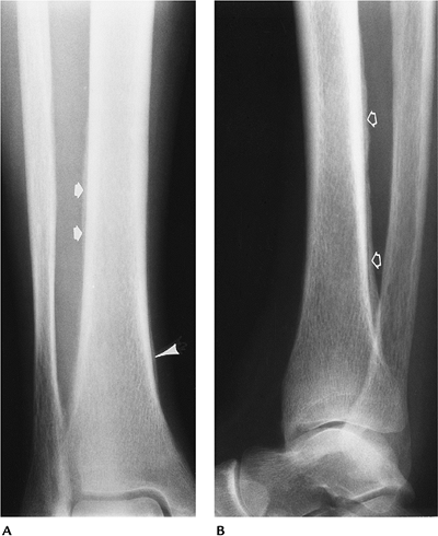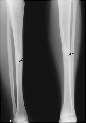 views of the tibia showing sclerosis along the posteromedial cortex resembling “dripping candle wax” that ends in the mid-diaphysis (arrow). |