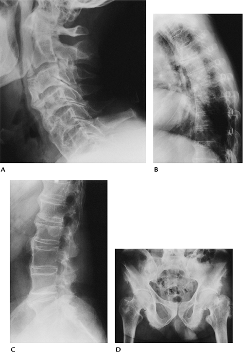 Lateral view of the cervical spine with prominent anterior ossification causing dysphagia. The disc spaces are preserved and at least four segments are involved. (B) Lateral radiograph of the thoracic spine with flowing osteophytic ossification and preserved disc spaces. (C) Lateral view of the lumbar spine with anterior ossification and normal disc spaces. (D) AP radiograph of the pelvis with ischial whiskering and prominent enthesophytes, especially on the left greater trochanter. |