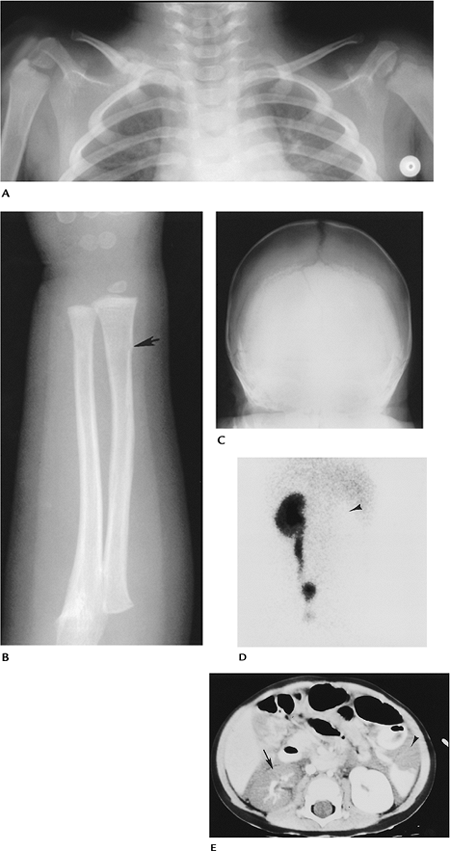 FIGURE 15-46 Nonaccidental trauma. (A) Radiograph of the clavicles shows a fracture of the right midclavicle with abundant callus formation. (B) Radiograph of the forearm shows a subtle torus fracture (arrow). (C) AP radiograph of the skull demonstrating a skull fracture. (D) Renogram in a 14-month-old shows no perfusion in the left kidney (arrowhead). (E) CT image demonstrating fluid in the abdomen with renal (arrow) and splenic (arrowhead) injuries.