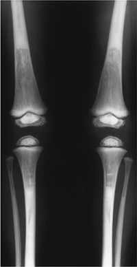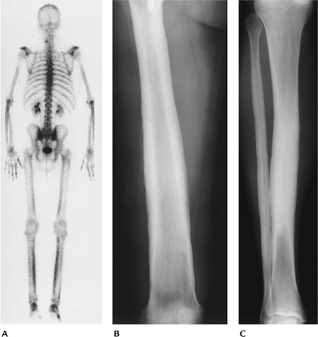 Radionuclide bone scan showing symmetric increased cortical uptake in the femora, tibiae, and upper extremities. AP radiographs of the femur (B) and tibia (C) showing marked diaphyseal cortical thickening with sparing of the metaphyses and epiphyses. |