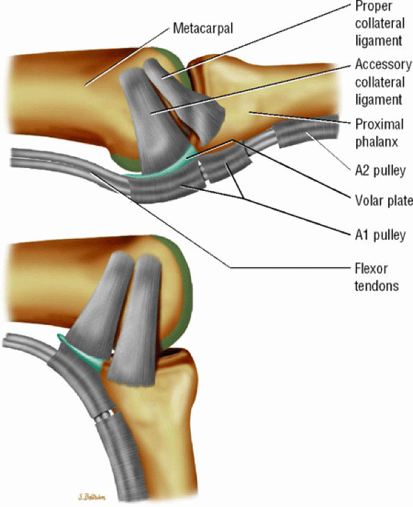 The volar plate is a fibrocartilaginous structure that becomes continuous with the articular surface on the palmar side (Fig. 11.3). The ACL is connected to the adjacent volar plate by the deep transverse metacarpal ligament. The volar plate is also connected to the flexortendon sheath (by the annular A1 pulley), strongly attached distally to the proximal phalanx, and loosely attached to the metacarpal neck by the checkreins.