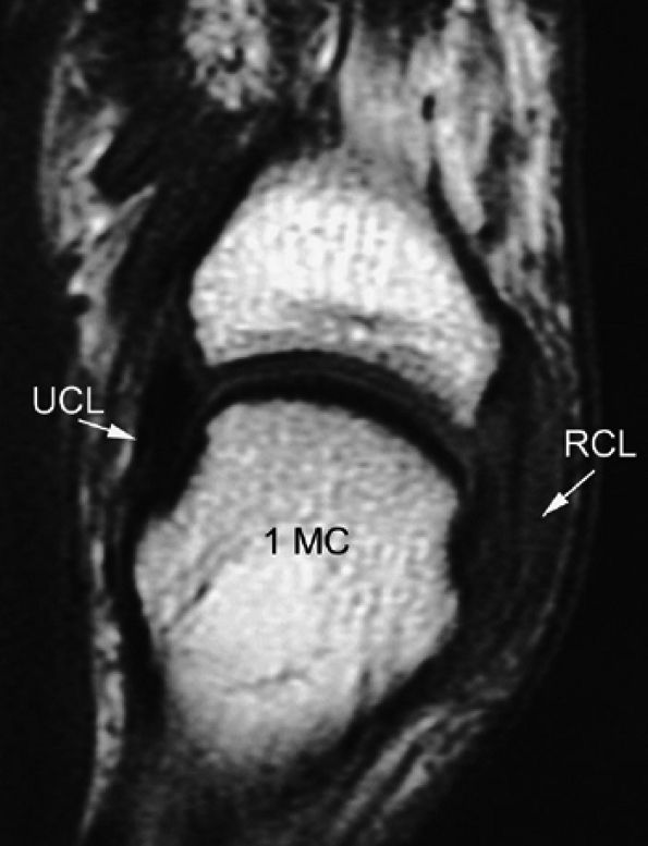 FIGURE 11.10 ● Coronal T1-weighted image showing an injury of the radial collateral ligament (RCL) of the first MP joint. The RCL demonstrates increased signal intensity and thickening all along its course.