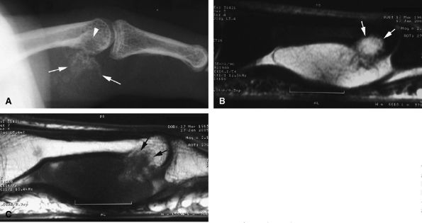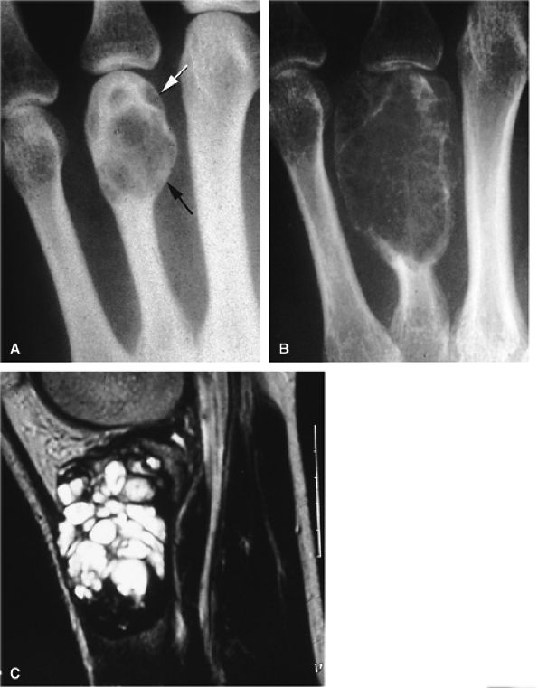 FIGURE 11.100 ● Giant cell tumor of the metacarpal. (A) Oblique view radiograph showing an expansile osteolytic lesion (arrows) of the distal metaphysoepiphysis of the fourth metacarpal. (B) One year later, there is an increase of expansion, cortex osteolysis, and numerous intralesional septa. (C) Sagittal T2-weighted image of the right knee shows the appearance of an identical lesion in the superior tibia.