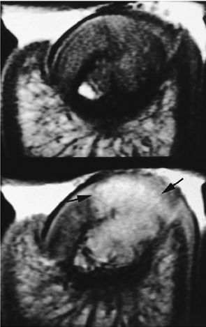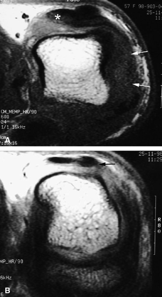 Inactive fibrous pannus (low signal on all sequences).364 Although fibrotic pannus may enhance, it does so with lower levels and on delayed images.365,366,367