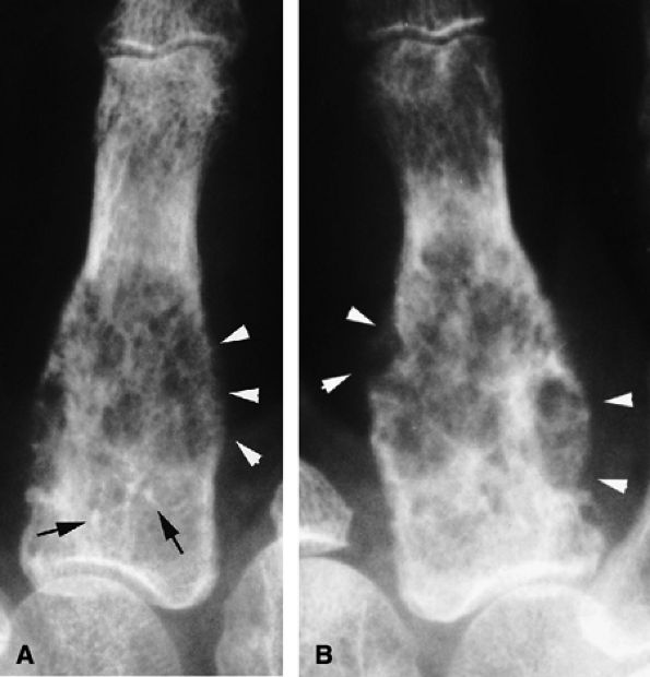 FIGURE 11.102 ● Chondrosarcoma of the metacarpal. (A) PA view radiograph showing a slightly expansile osteolytic lesion of the proximal third of the metacarpal. Intralesional calcifications (arrows) are compatible with an enchondroma, but cortex osteolysis with periosteal reaction (arrowheads) is unusual. (B) At follow-up 3 months later, there has been a significant increase in size and extensive cortex osteolysis (arrowheads).