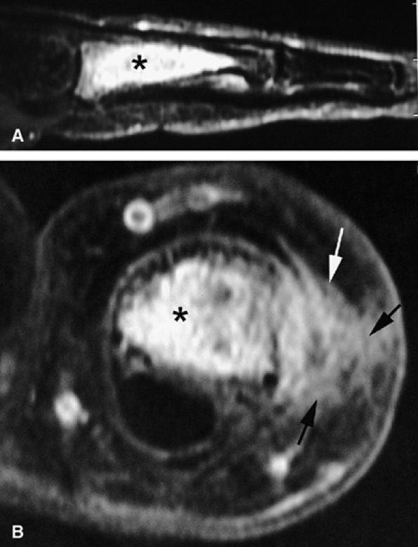 FIGURE 11.103 ● Chondrosarcoma (asterisk) of the proximal phalanx. (A) STIR image showing a centromedullary tumor with high signal intensity compatible with cartilage content. (B) Axial post-contrast fat-suppressed T1-weighted image showing intralesional diffuse enhancement with cortex osteolysis and extension toward the soft tissues (arrows).