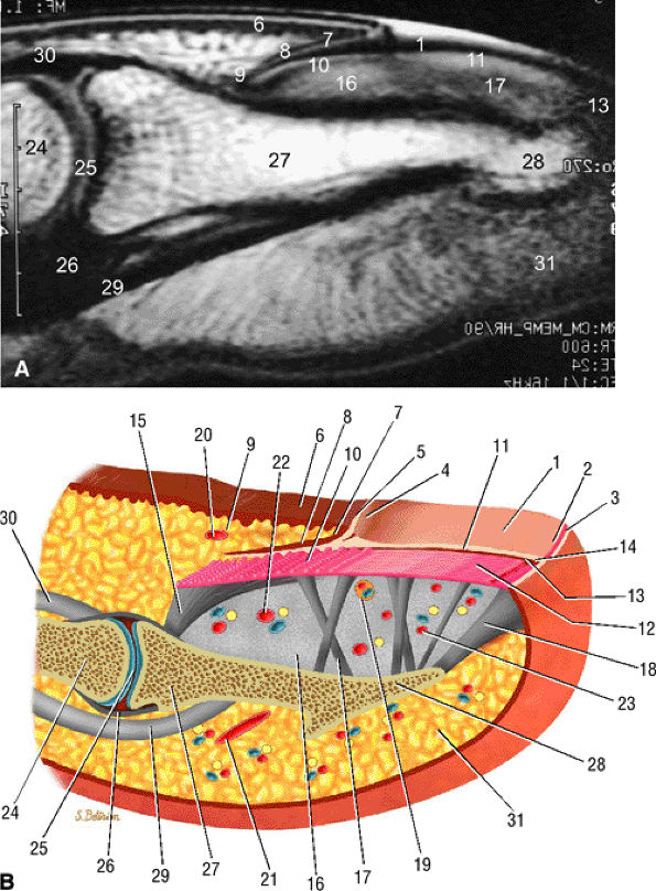 FIGURE 11.104 ● Sagittal anatomy of the nail unit. (A) T1-weighted image showing the surface of the nail plate (arrows) highlighted by petroleum jelly deposits. (B) Dorsal oblique view of the nail unit: 1, nail plate; 2, onychodermal band; 3, free edge of plate; 4, lunula; 5, cuticle; 6, proximal nail fold; 7, inferior aspect of proximal nail fold or eponychium; 8, proximal or dorsal nail matrix; 9, cul-de-sac; 10, intermediate or ventral nail matrix; 11, nail bed epithelium ridges; 12, nail bed corium; 13, hyponychium; 14, distal groove; 15, matrix phalangeal ligament; 16, submatrical hypersignal area; 17, network of collagenous fibers; 18, hyponychio-phalangeal ligament; 19, glomus body; 20, proximal dorsal arterial arch; 21, distal dorsal arterial arch; 22, distal matrix arterial arch; 23, nail bed arterial arch; 24, middle phalanx; 25, distal interphalangeal joint; 26, volar plate; 27, distal phalanx; 28, tuberosity of distal phalanx; 29, flexor digitorum profundus tendon; 30, terminal band of extensor tendon; 31, pulp.