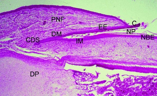 FIGURE 11.105 ● Photomicrograph of nail matrix in sagittal section with hematoxylin and eosin staining. PNF, proximal nail fold; EE, epithelium eponychium; C, cuticle; DM, dorsal matrix; IM, intermediate matrix; NBE, nail bed epithelium; CDS; matrix cul-de-sac; NP, nail plate; DP, distal phalanx.