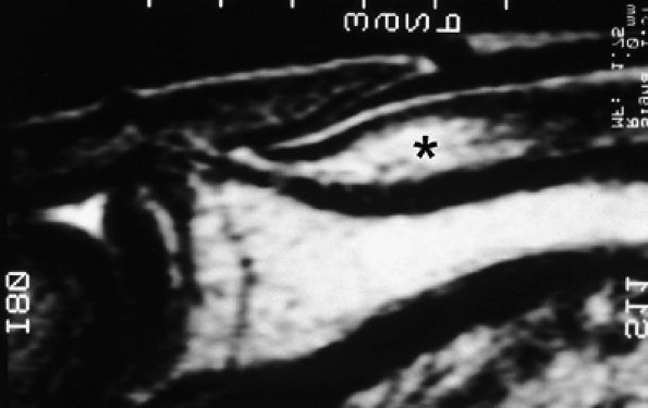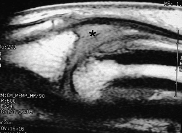 FIGURE 11.21 ● Sagittal T1-weighted images at the site of a volar plate injury of the PIP joint. The volar plate is absent. Note the associated injury of the dorsal capsule, which appears thickened (asterisk).