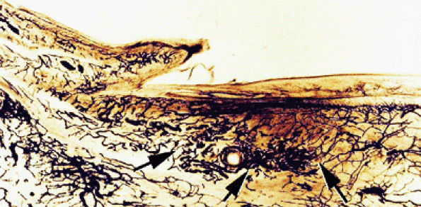 FIGURE 11.107 ● Microvascularization of the submatrix area. Photomicrograph with transparency using the Spalteholz technique, vascular injection with gelatinous India ink. The vascular networks are more regular in the submatrix area (arrows) than in the nail bed.