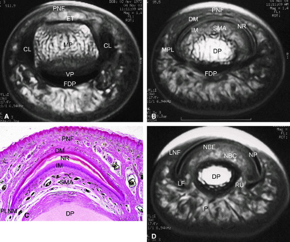 FIGURE 11.108 ● Axial anatomy of the nail unit. (A) Distal interphalangeal joint. (B) Matrix area. (C) Photomicrograph of the matrix area with hematoxylin and eosin staining. (D) Nail bed area. ET, extensor tendon; PNE, posterior nail fold; CL, collateral ligament; MP, middle phalanx; VP, volar plate; FDP, flexor digitorum tendon; MPL; matricophalangeal ligament; NR, nail root; PLNM, posterolateral corners of the nail matrix; SMA; submatrix area; DM; dorsal matrix; IM, intermediate matrix; DP, distal phalanx; P, pulp; LF, ligament of Flint; NBE, nail bed epithelium; NBC, nail bed corium; LNF, lateral nail fold; RU; rima ungualum.