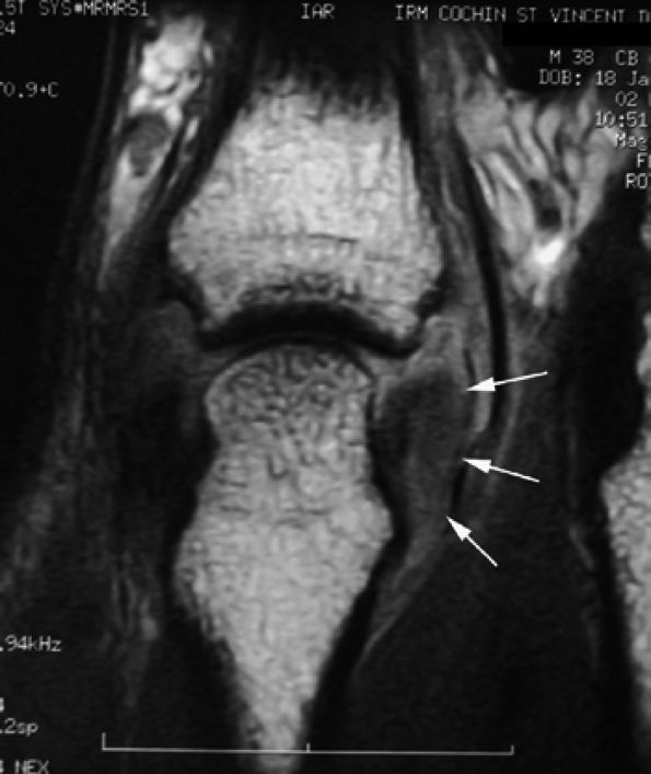 FIGURE 11.11 ● Tear of the radial collateral ligament (RCL) of the fifth metacarpophalangeal joint is shown on this coronal post-contrast T1-weighted image. The distal insertion of the RCL is proximally retracted and thickened (arrows).