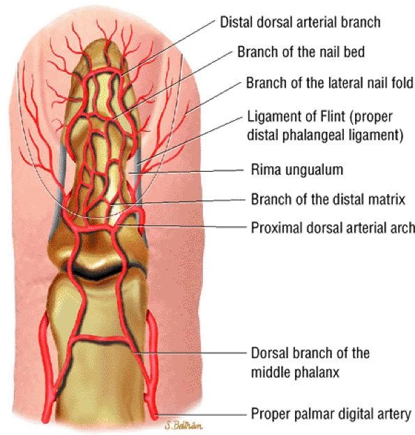 FIGURE 11.110 ● Dorsal aspect of the arterial supply of the fingertip.