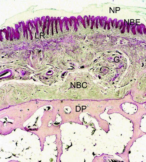 FIGURE 11.111 ● Photomicrograph of axial slice of the nail bed area with hematoxylin and eosin stain. The longitudinal ridges of the nail bed epithelium interdigitate with nail bed fibrocollagen. NP, nail plate; NBE, nail bed epithelium; G, glomus body; NBC, nail bed corium; LR, longitudinal ridges; DP, distal phalanx.
