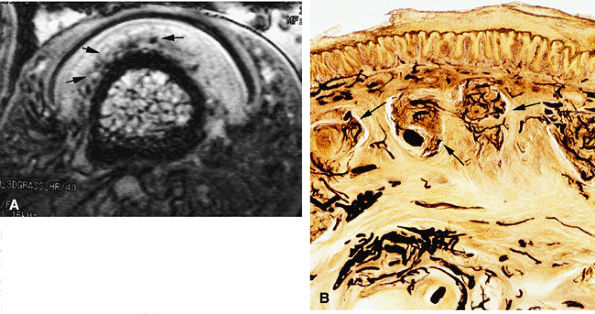 FIGURE 11.112 ● Glomus bodies. (A) Axial post-contrast 3D gradient-echo image of the nail bed showing multiple round foci representing glomus bodies (arrows). (B) Photomicrograph with transparency using the Spalteholz technique, vascular injection with gelatinous India ink, axial slice showing glomus bodies (arrows).