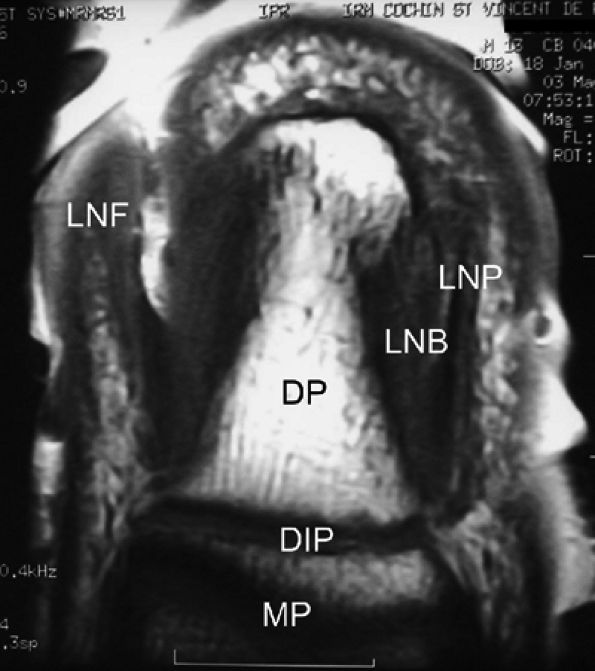 FIGURE 11.113 ● Coronal anatomy of the nail unit on T1-weighted images. MP, middle phalanx; DP, distal phalanx; DIP, distal interphalangeal joint; LNB, lateral nail bed; PNF, proximal nail fold; LNP, lateral border of nail plate.