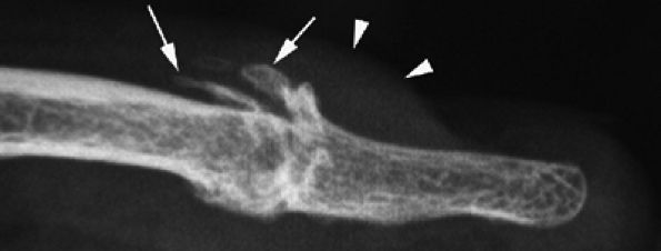 FIGURE 11.114 ● Mucoid pseudocyst. Lateral view radiograph showing distal interphalangeal joint osteoarthritis with dorsal osteophytes (arrows) and thickening of the posterior nail fold (arrowheads).