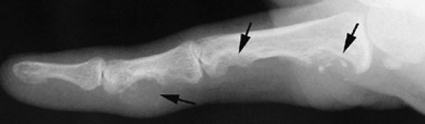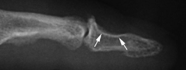 FIGURE 11.115 ● Mucoid pseudocyst. Lateral view radiograph showing distal interphalangeal joint osteoarthritis with bone pressure erosion (arrows) of the dorsal aspect of the distal phalanx.