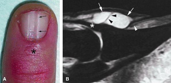 FIGURE 11.116 ● Mucoid pseudocyst. (A) PA view photograph showing thickening of the posterior nail fold (asterisk) and nail groove (arrows) on the midline due to matrix compression. (B) Sagittal STIR image displaying a bilobed cyst of the posterior nail fold (arrows) close to the insertion of the extensor tendon (asterisk). Note the intralesional septum (black arrowheads). The cyst causes deep displacement of the nail root (white arrowhead).