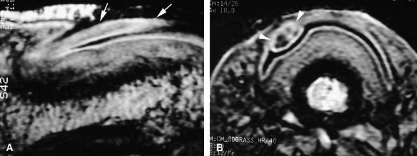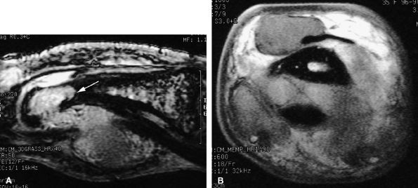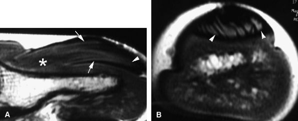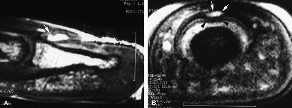 FIGURE 11.140 ● Fibrokeratoma. Sagittal (A) and axial (B) 3D gradient-echo images of a tumor involving the ventral aspect of the proximal nail fold with epithelial invagination (arrows), which is an incidental matrix producing a pseudonail of collagen. Overlying acanthotic epidermis displays signal intensity identical to that of normal epidermis (arrowheads).