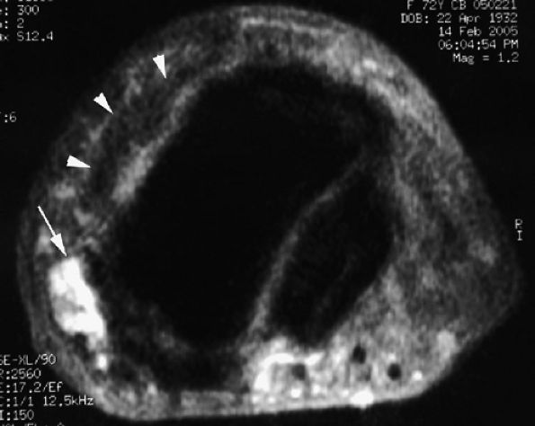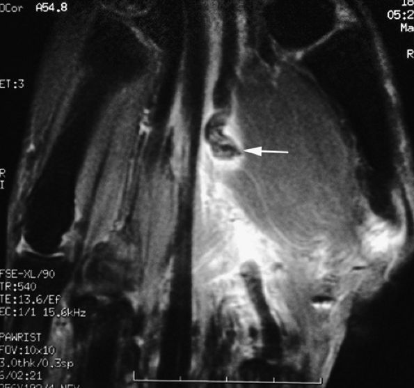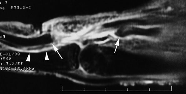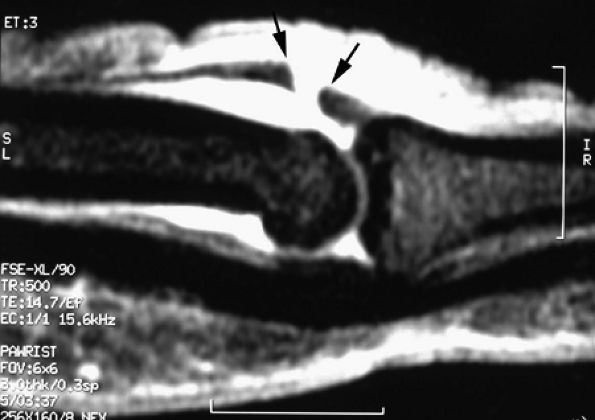 FIGURE 11.123 ● Subungual mucoid pseudocyst. Sagittal T2-weighted image of a subungual cyst (arrow) with extension toward the pulp (arrowheads).