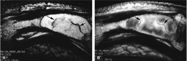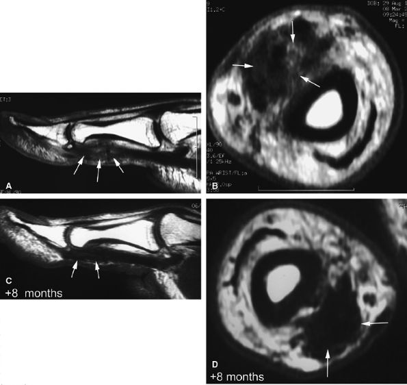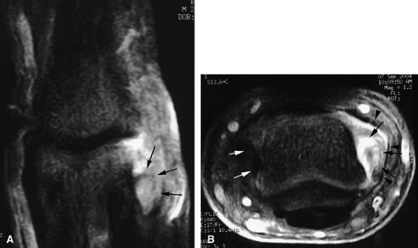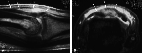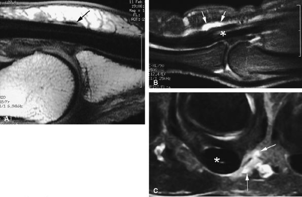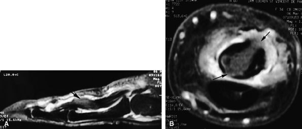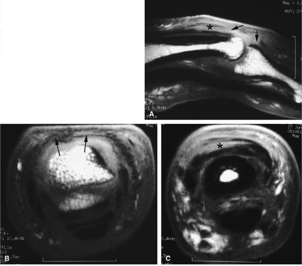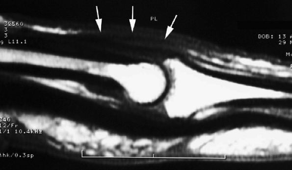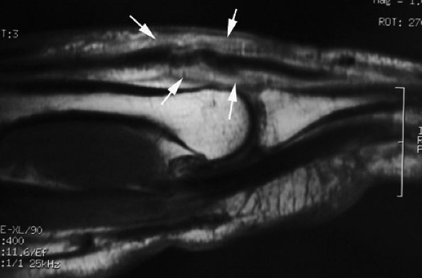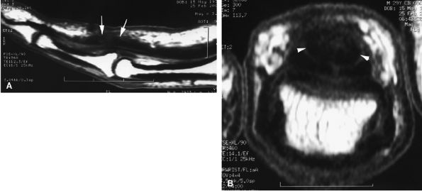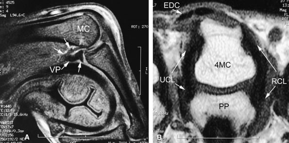 MR imaging also depicts common associated lesions (extensor hood, volar plate) in more than 40% of cases (Fig. 11.15).10