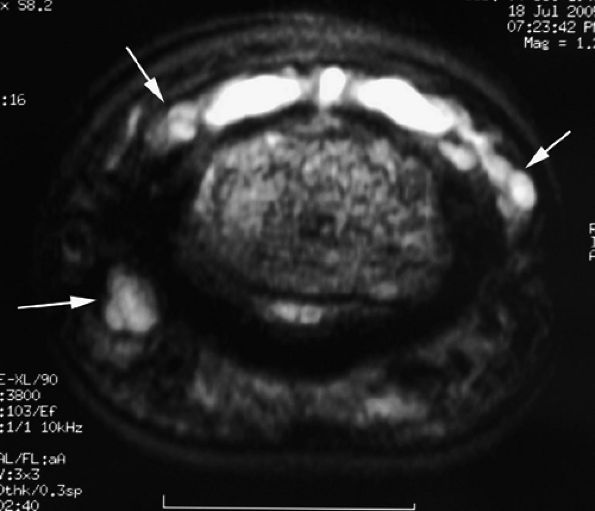 FIGURE 11.119 ● Multiple mucoid pseudocysts. Sagittal T2-weighted image shows multiple cysts in the posterior nail fold and the pulp (arrows).