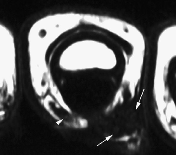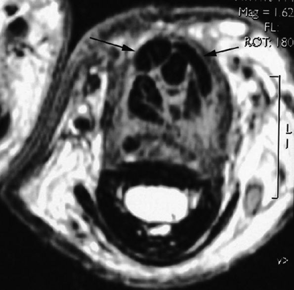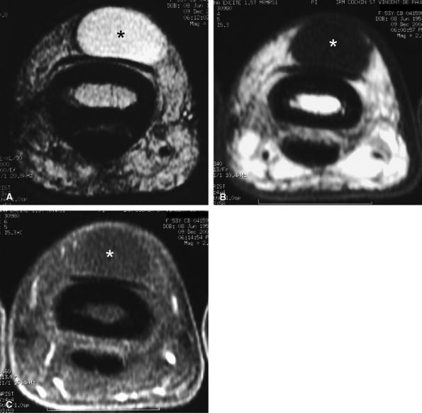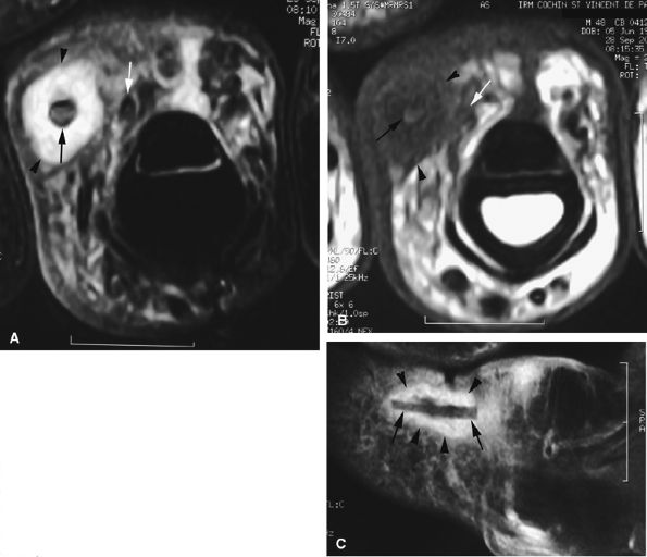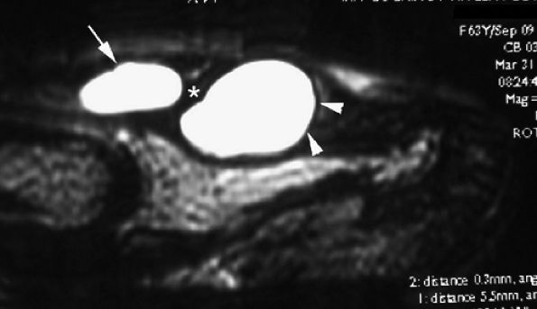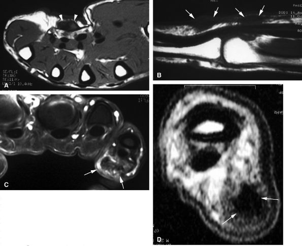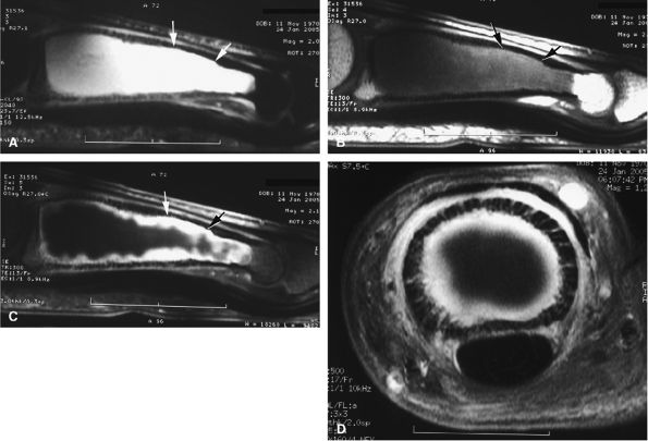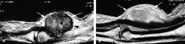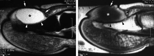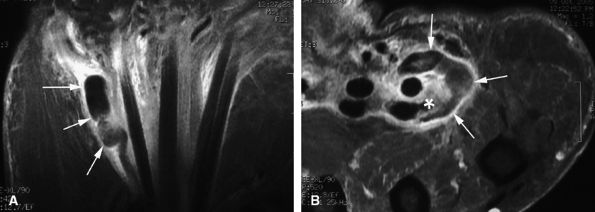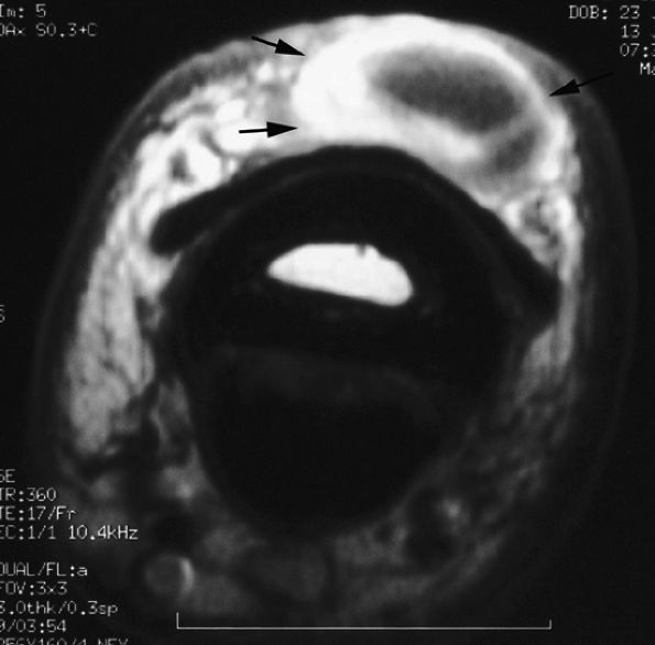 FIGURE 11.120 ● Overhanging multiloculated mucoid pseudocyst. Axial T2-weighted images show the cyst extending on both sides of the posterior nail fold (arrows) and the pulp (arrowhead).