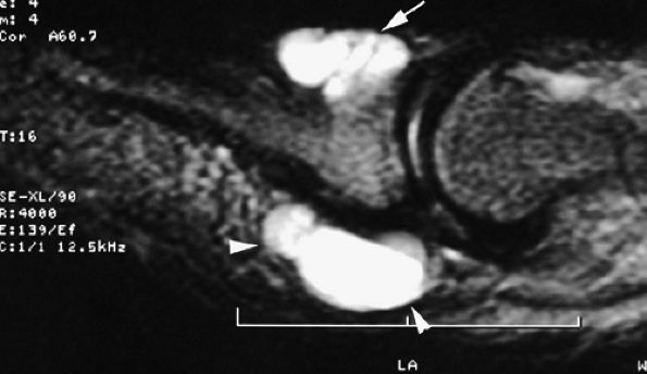 Intravenous injection of gadolinium may increase image contrast, making it possible to visualize small ligament tears (Fig. 11.13).10 Tears may involve the distal or proximal insertion or the middle third of the ligament (Figs. 11.13 and Fig. 11.14).