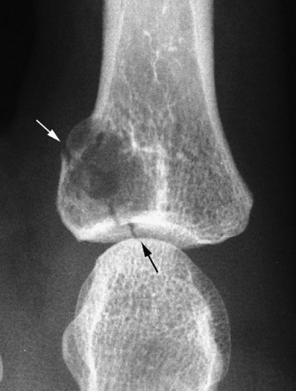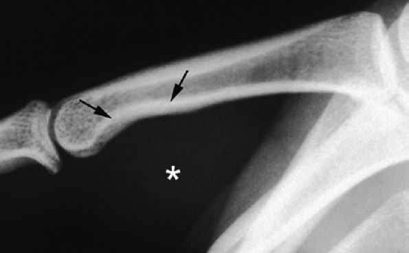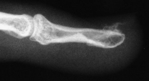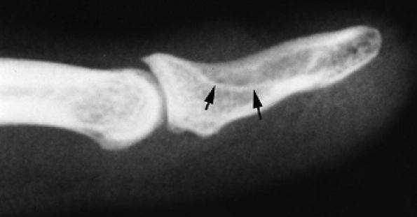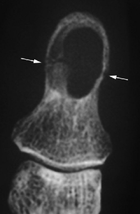 FIGURE 11.124 ● Epidermal inclusion cyst. PA view radiograph of fracture (arrows) of a clear-cut round erosion of the distal phalanx.