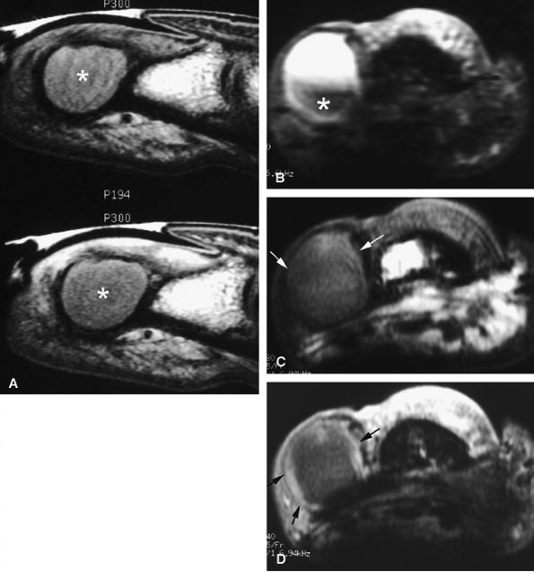 FIGURE 11.125 ● Epidermal inclusion cyst. (A) Sagittal T1-weighted images before and after injection of gadolinium show an expansile bone inclusion of the distal phalanx (asterisk) that does not enhance after contrast administration. (B–D) Postoperative epidermal inclusion cyst in a separate case. (B) Axial STIR image shows a cyst with variable signal and a low-signal component (asterisk). On axial T1-weighted images before (C) and after (D) injection of gadolinium, there is a thin rim of high signal intensity, identical to that of normal epidermis (arrows). No bone involvement is seen.