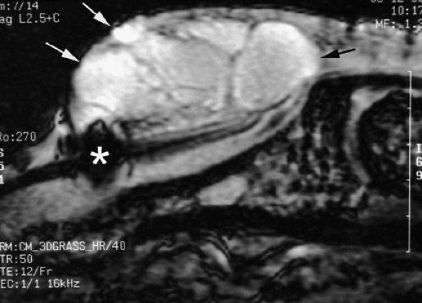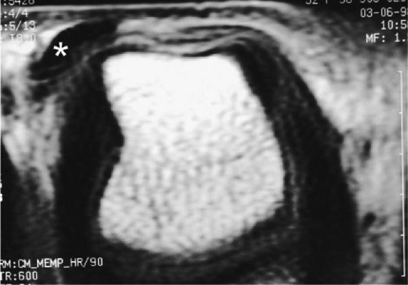 FIGURE 11.106 ● Submatrix area. Sagittal T2-weighted image depicting the oval shaped submatrix area (asterisk).