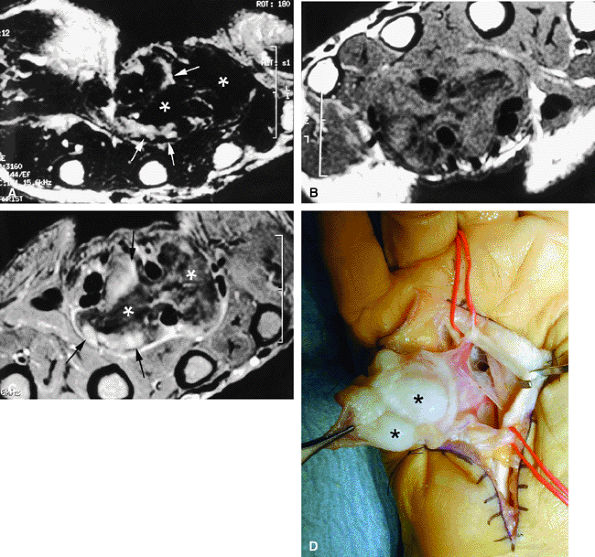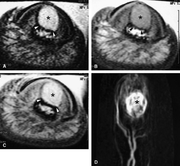FIGURE 11.128 ● Vascular-type glomus tumor (asterisk) of the nail bed with the most common signal characteristics. (A) Axial T2-weighted image. T1-weighted images before (B) and after (C) injection of gadolinium. (D) MR angiogram. The tumor is located on the midline with an underlying bone erosion (arrowheads). The signal is high on T2-weighted images and slightly high on T1-weighted images. There is strong post-contrast enhancement on T1-weighted images and MR angiography.