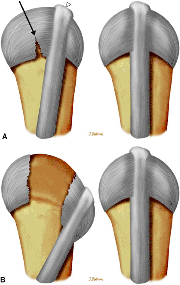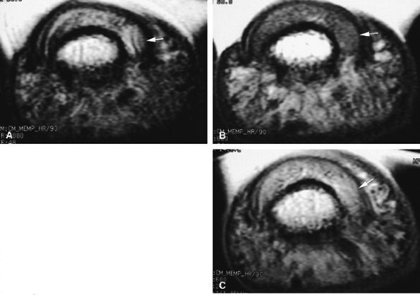 Sagittal 3D gradient-echo sequences allow oblique reformats along the long axis of the tendons. These images are also subject to the magic angle phenomenon and to magnetic susceptibility artifacts due to micrometallic deposits from suture placement.45