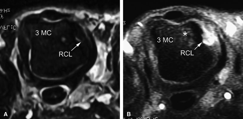 FIGURE 11.13 ● Proximal tear of the radial collateral ligament (RCL) of the third metacarpophalangeal joint. Comparison of axial STIR (A) and post-contrast fat-suppressed T1-weighted image (B). Focal irregularity and slight hyperintensity of the RCL can be seen on the STIR image. Strong enhancement of the proximal part of the RCL and bone edema (asterisk) is seen on the T1-weighted images. MC, metacarpal.